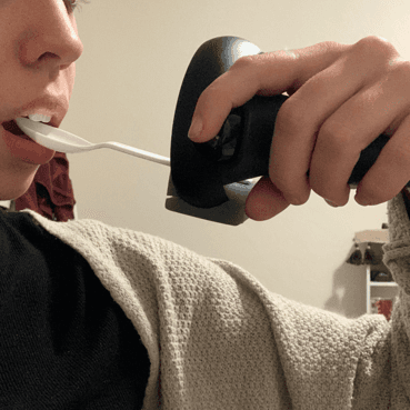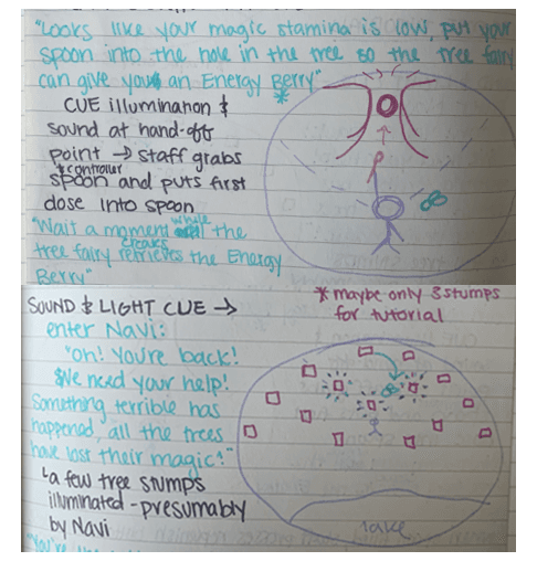 In the experiuence, patients gain magical powers by consuming glowing energy orbs. Each bite strengthens their abilities and advances the story. We tracked the spoon in real-time so that real-world eating translated directly to in-game progress. We prototyped multiple different 3D-printed attachments that connected the spoon to the VR controller. The setup had to work for older kids who can self feed and younger patients who would be fed by a nurse. The other key part of this was creating a companion experience for the nurse to mark when a bite was complete. Just recognizing it through proximity could result in false positives. After a successful bite, patients could use their powers to transform the stumps and fallen trees in a barren forest into a living, magical forest. Each spell cast returned color to the world and made the next bite something to look forward to.
