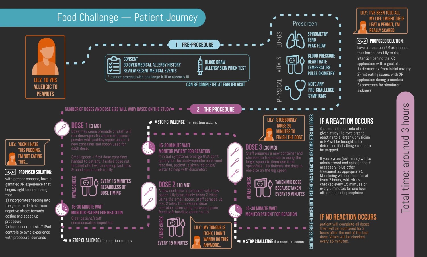 An Oral Food Challenge is one of the more stressful medical procedures a child can go through. Under supervision, they eat gradually increasing doses of a suspected allergen (peanut, egg, milk) while doctors monitor their reaction. For young kids, the anxiety alone can produce symptoms that look like an allergic response, complicating the diagnosis and prolonging the test. The question was whether immersive technology could reduce that anxiety enough to make the procedure go more smoothly. I went in without a predetermined answer. Working through Stanford's Virtual Human Interaction Lab in partnership with Sean N. Parker Center for Allergy and Asthma Research, we ran three sequential research phases: a need-finding with doctors and patients, a prototyping and development phase for VR in a medical setting, and a feasibility pilot. I spent months observing OFCs at Stanford Children's Hospital before anything was designed.